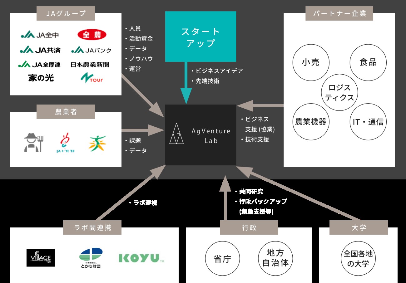 <参考>AgVenture Lab(アグベンチャーラボ)は、JAグループ全国連8団体で立ち上げたイノベーションラボです。 スタートアップ企業やパートナー企業・大学・行政等と協創し、様々な知見やテクノロジーを活用しながら、新たな事業創出、サービス開発、社会課題の解消を目指し活動しています。