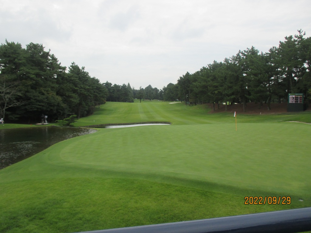 今日のピンの位置は左側センターでしたのでプロは簡単ですが最終日は池のすぐぞばの右側に切られるので池ポチャや左に逃げると大体3パットになり勝負の分かれ目になります。