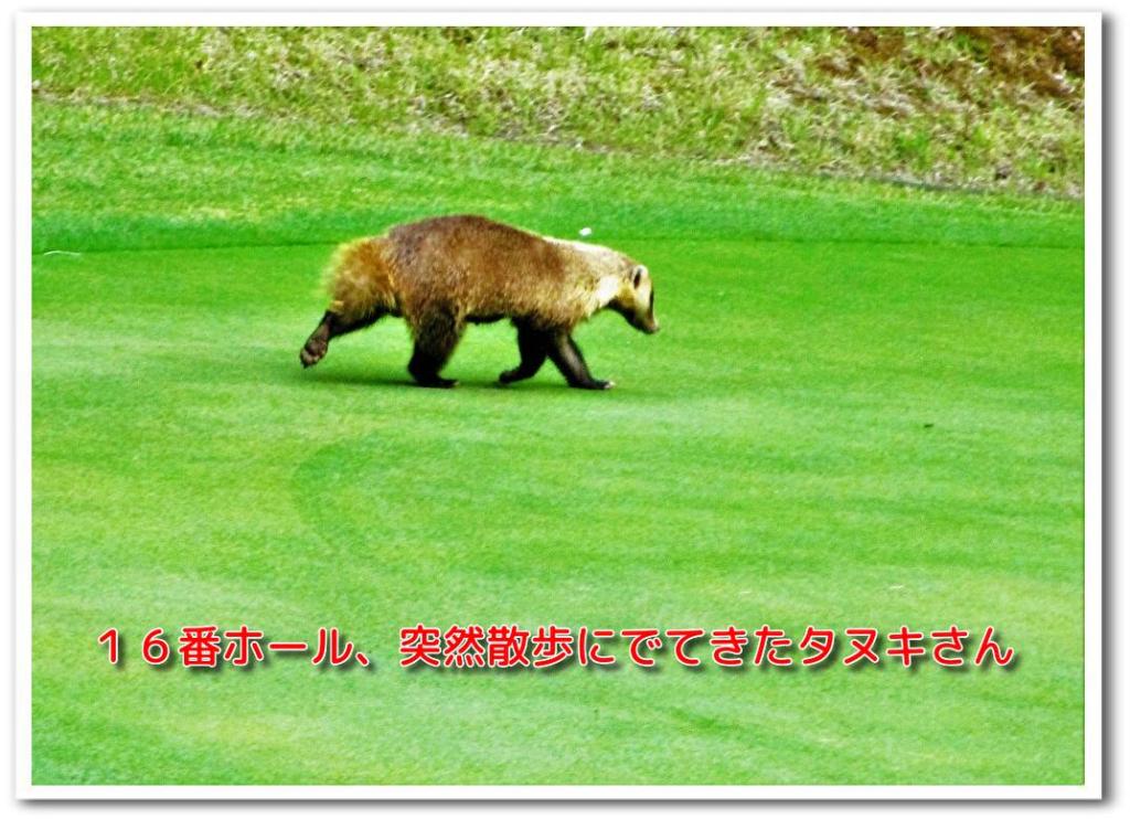 16番ホールのグリーン上で狸に出会いびっくり。狸は我々を見ても驚かずゆっくりとグリーン上を横切り森に消えていきました。その間パッテイングは待ちぼうけ。